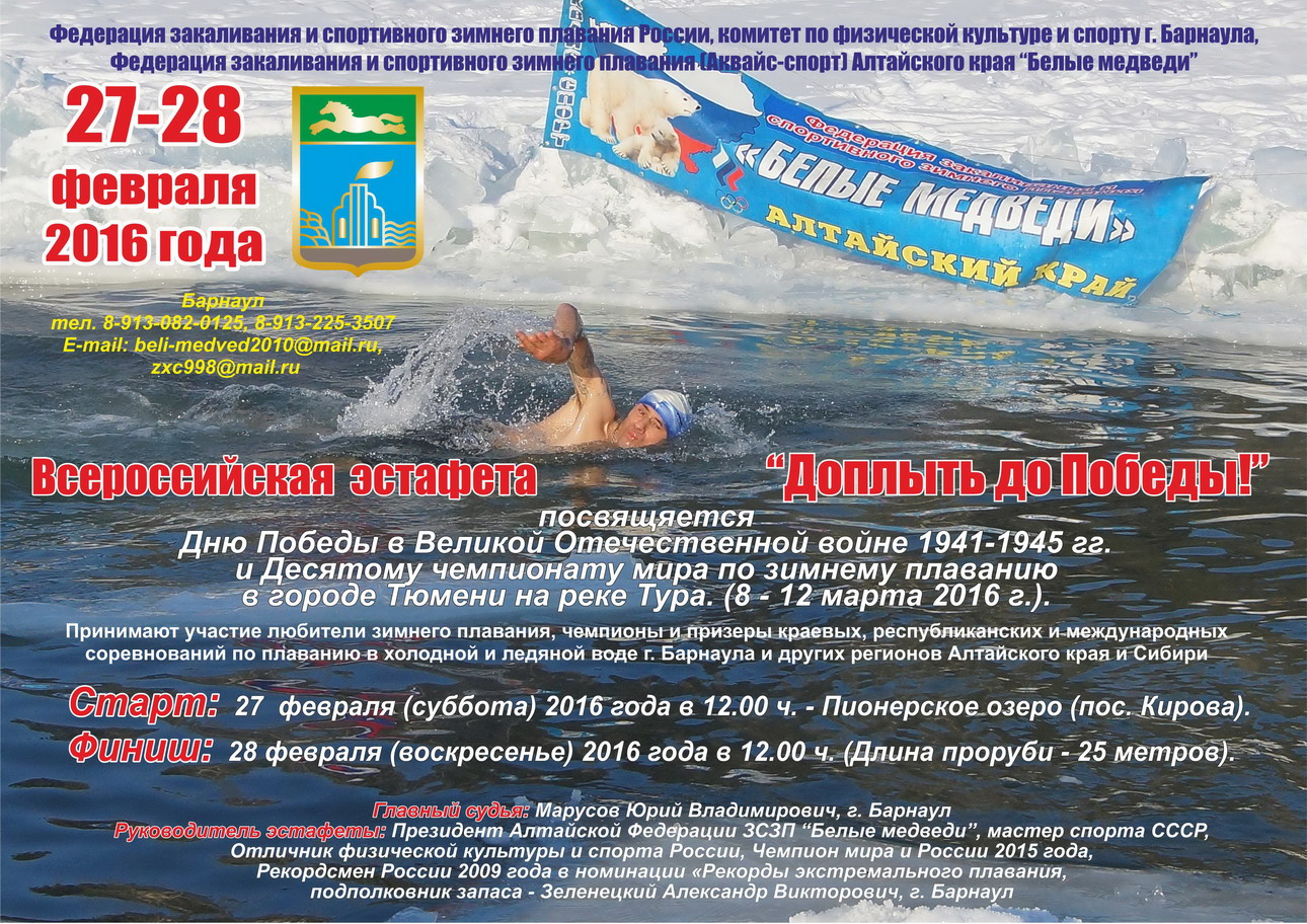 Объявление. 23 апреля 2016 г. в г. Чебоксары пройдёт открытое первенство Чувашской республики по зимнему плаванию, посвященное Международному дню Матери-Земли. В программе - личные заплывы на дистанции от 25 до 300 м, эстафета 4х25 м. Официальное "Положение" и контакты - в этом файле (PDF, 1.7 Mb), бланк заявки на участие - в этом файле (DOC, 41 Kb). Независимо от погоды ледяная вода ГАРАНТИРУЕТСЯ!