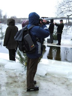 ![]() Начало молебна. У края проруби остались, в основном, журналисты - служба у них такая! |