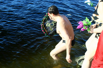 Сейчас венок будет возложен на воду. |